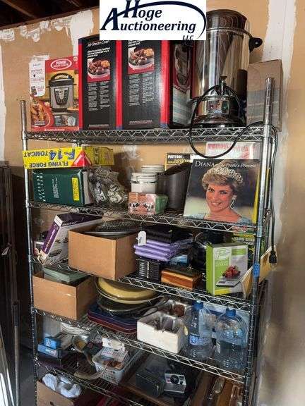 LOT 3004 - Coffee pot, jetstream oven, canisters plates, trays, Polaroid camera, and much more. Shelf unit not