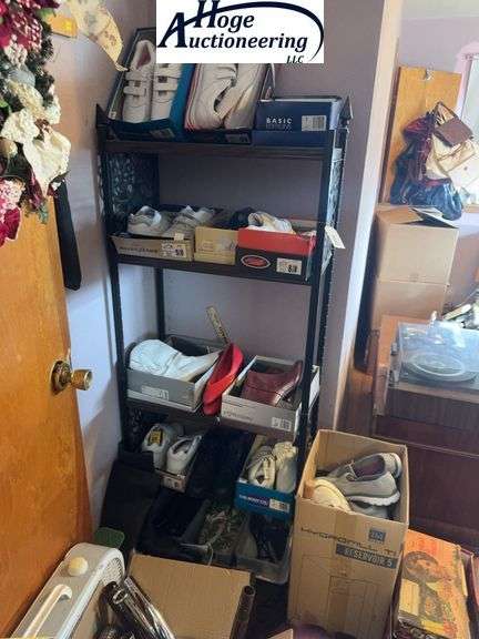 LOT 3052 - Metal shelf all contents-shoes mostly size 8 1/2-9, box fan, bucket