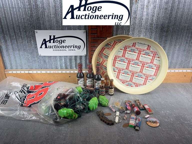 LOT 3085 - PLASTIC BUDWEISER BEER TRAYS(ONE CRACKED), ASST BUD BOTTLES, LIGHTERS, FROG LIGHTS, MISC