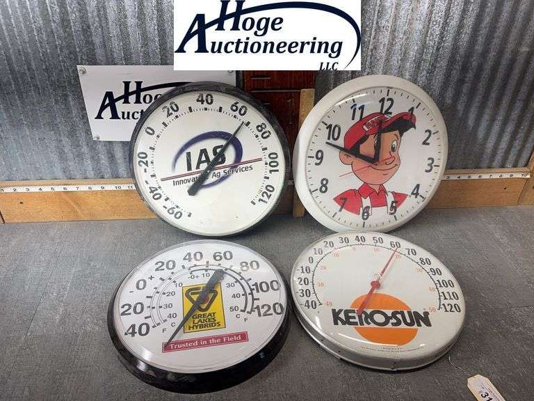 LOT 3161 - (3) THERMOMETERS--KEROSUN, GREAT LAKES HYBRIDS, IAS, (1) HARDWARE HANK CLOCK 12"