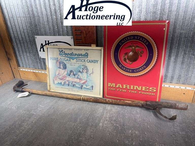 LOT 3324 - MARINES TIN SIGN 12W X 17T, WOODWARD'S FRAMED AD 12X15, VINTAGE GRABBER TOOL 42"L