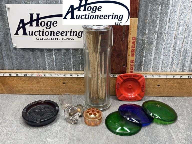 LOT 3502 - ASST--SODA FOUNTAIN STRAW JAR, ASHTRAYS, GLASS DOORKNOB, GLASS FLOWER FROG