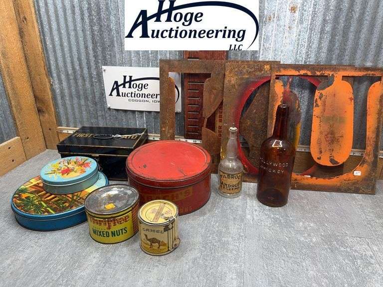 LOT 3542 - ASSORTED TINS, CUT-OUT LETTERS, BROWN BOTTLE
