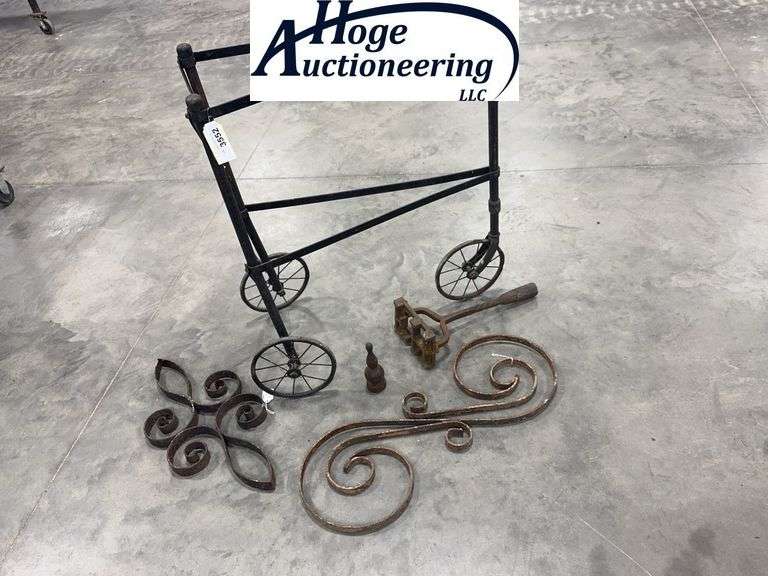 LOT 3552 - DECORATIVE IRON PIECES, 3-WHEEL FRAME 25L X 31"T
