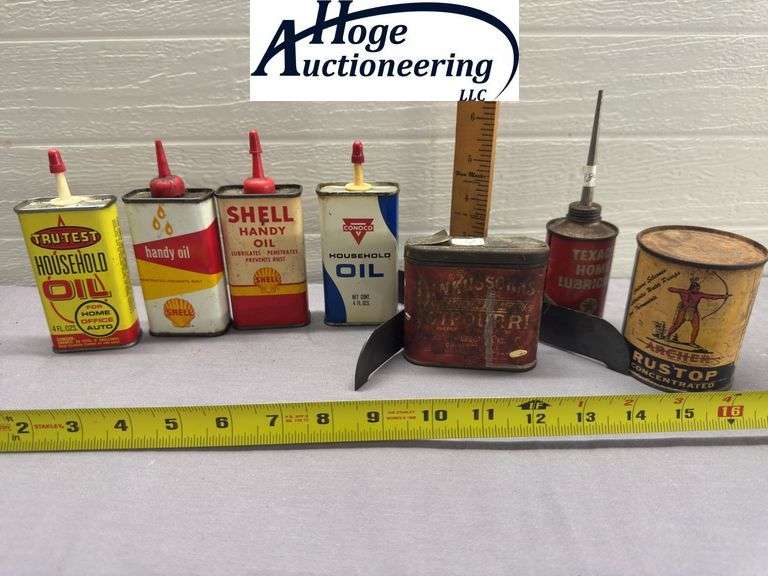 LOT 4147 - 7 cans. Oil, lubricant, smoking tobacco. 1 Archer, 1 Tru-Test, 2 Shell, 1 Conoco, 1 Texaco, 1 Pinkus