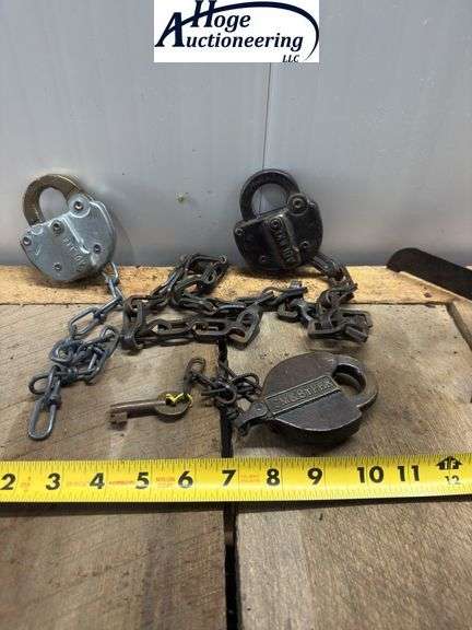 LOT 4368 - 3 misc. padlocks with chains. 2 ADLAKE, 1 CM & STPRR