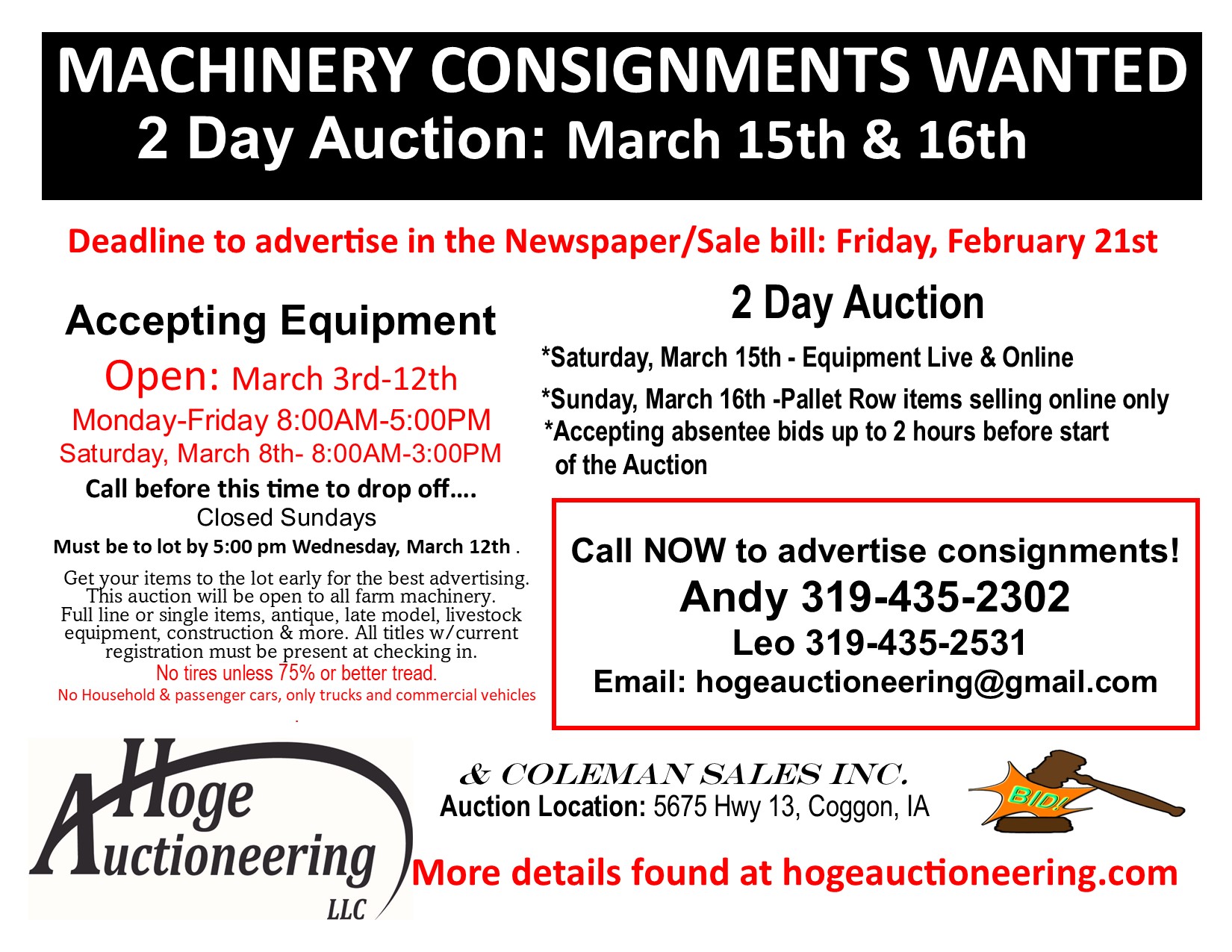 Any questions call Andy or Jodi 319-435-2302 or email jodi@hogeonlinebids.com, andy@hogeonlinebids.com