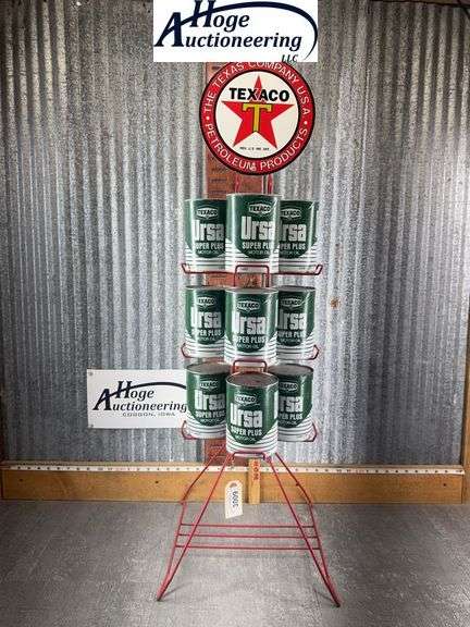 Lot 3009:TEXACO WIRE DISPLAY RACK W/ 9 QUARTS OIL, FULL, 40" TALL